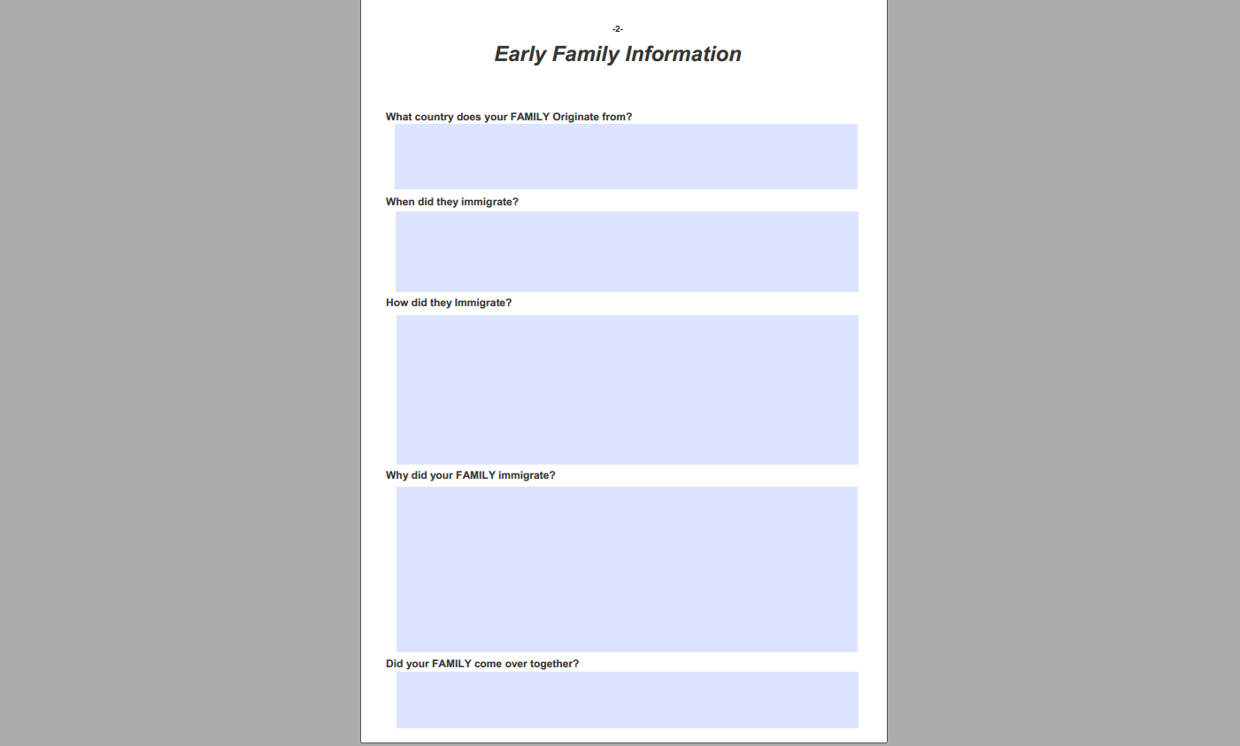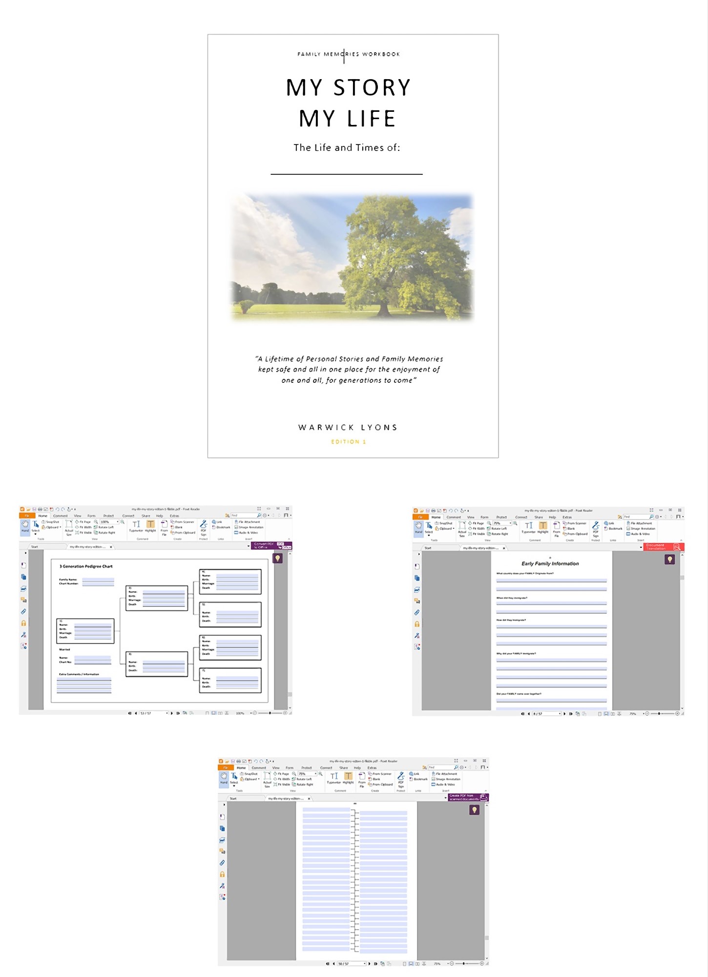 Over 55 pages of questions from Childhood through to retirement with fillable sections so you can add, save and edit information on your computer before you print it off.